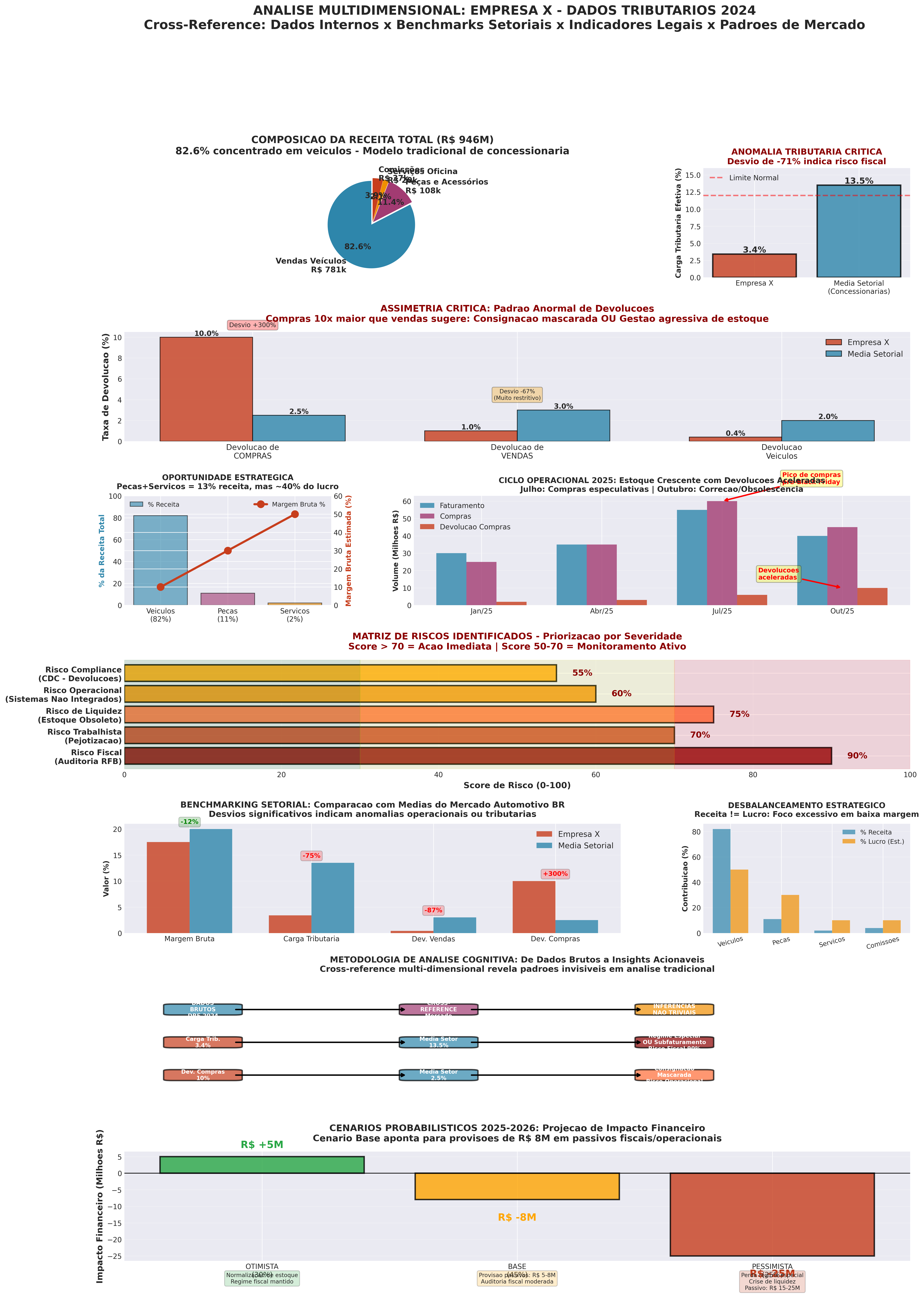Dashboard integrado com 10 visualizações: Composição de receita, anomalias tributárias, assimetria de devoluções, margens por segmento, sazonalidade, scorecard de riscos, benchmarking setorial, fluxo de inferências e cenários probabilísticos.